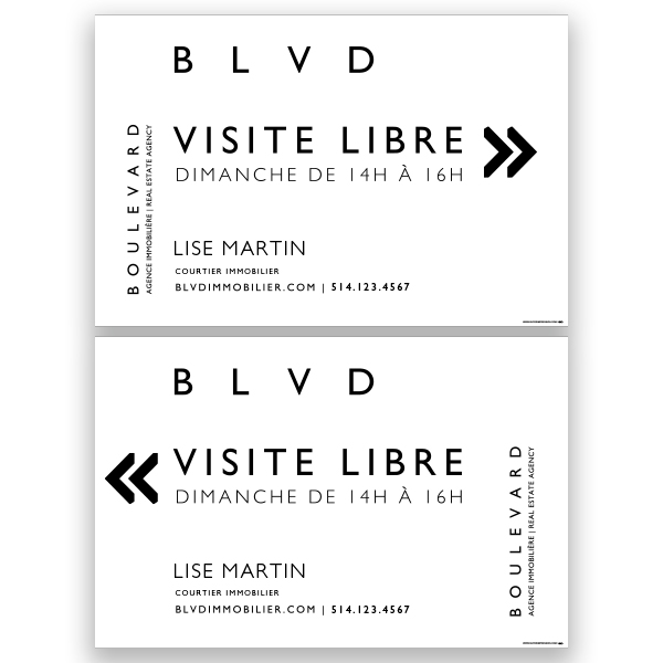 Official Boulevard Immobilier arrow. Printed on high grade 4MM coroplast. For posts, Size 23.5 X 15.5 without photo.