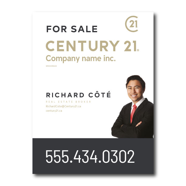 Official Century 21 sign. Printed on high grade 4MM coroplast. For posts, Size 23.5 X 31.5 with broker's picture.