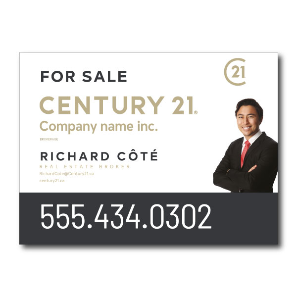 Official Century 21 sign. Printed on high grade 4MM coroplast. For posts, Size 31.5 X 23.5 with broker's picture.