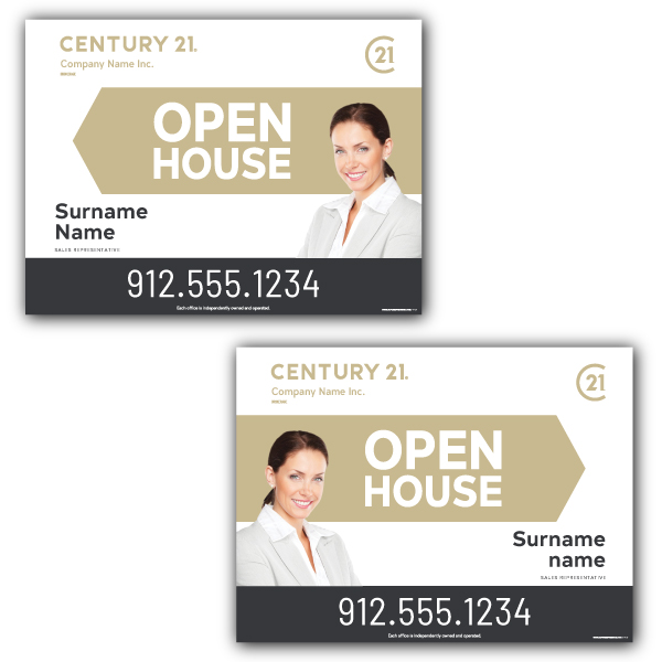 Official Century 21 arrow. Printed on high grade 4MM coroplast. For posts, Size 23.5 X 11.5 with broker's picture.