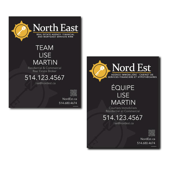 Official Nord Est Immobilier sign. Printed on high grade 4MM coroplast. For posts, Size 23.5 x 30 without photo.