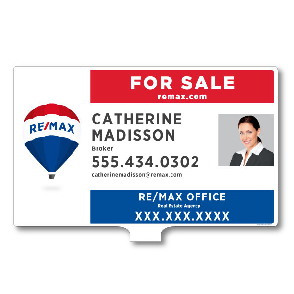 Official RE/MAX sign. Printed on high grade 4MM coroplast. For posts, Size 35.5 X 23.5 with broker's picture.