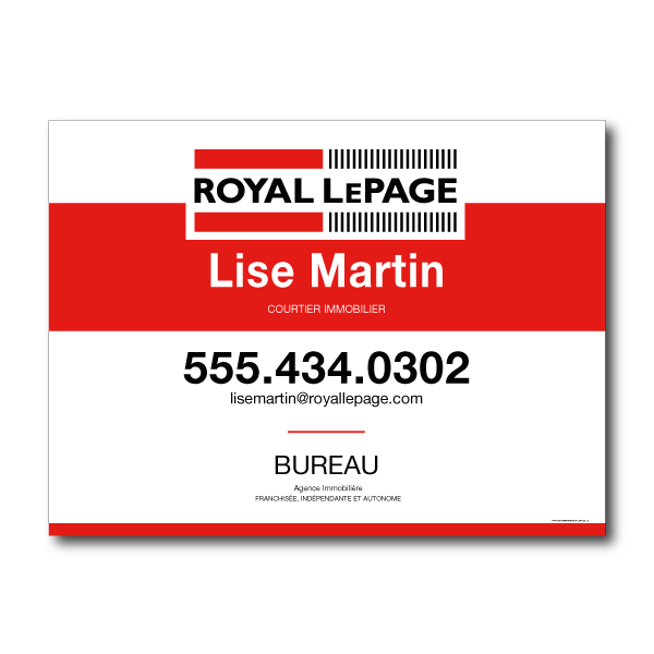 Official Royal Lepage sign. Printed on high grade 4MM coroplast. For posts, Size 31.5 X 23.5 without photo.
