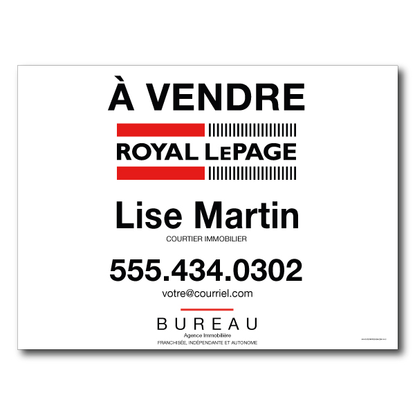 Official Royal Lepage sign. Printed on high grade 4MM coroplast. For posts, Size 31.5 X 23.5 without photo.