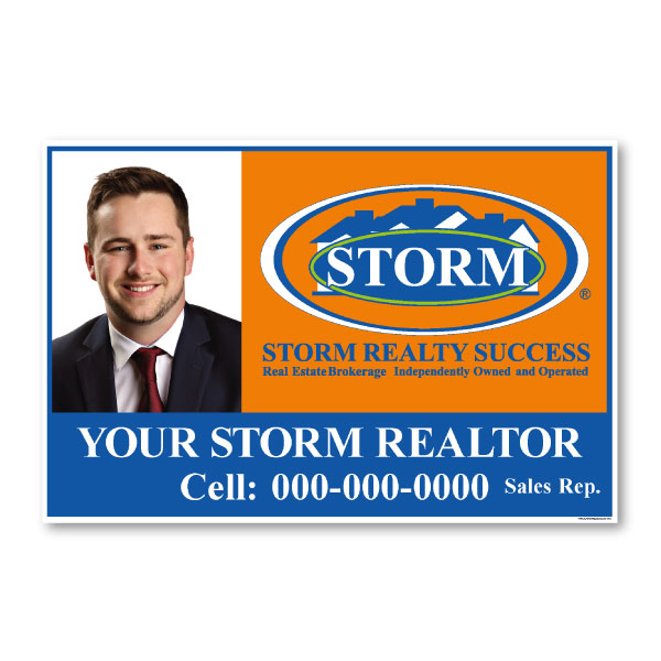 Official Storm Realty sign. Printed on high grade 4MM coroplast. For posts, Size 35.5 X 23.5 with broker's picture.