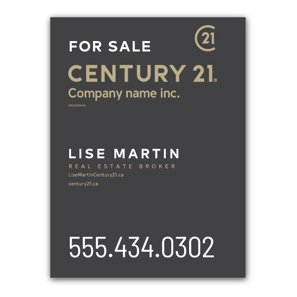 Pancarte officielle de Century 21. Imprimée sur un coroplast de haut grade 4MM. Pour poteaux, format 23.5 X 31.5 sans photo.