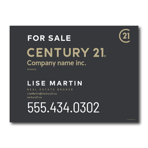 Pancarte officielle de Century 21. Imprimée sur un coroplast de haut grade 4MM. Pour poteaux, format 31.5 X 23.5 sans photo.