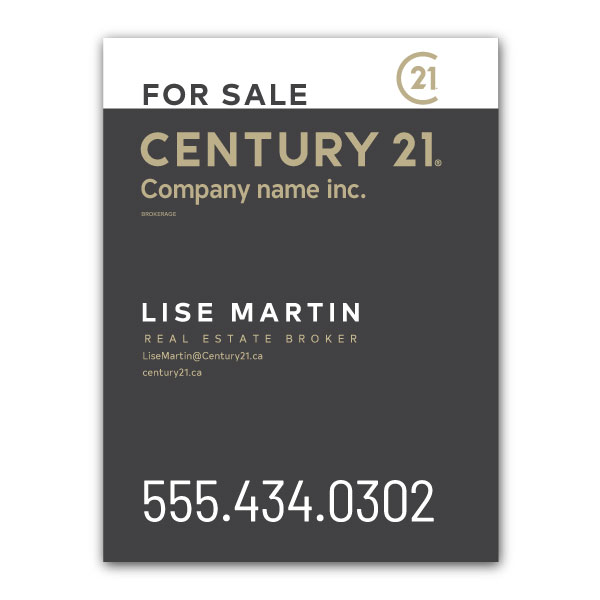 Pancarte officielle de Century 21. Imprimée sur un coroplast de haut grade 4MM. Pour poteaux, format 23.5 X 31.5 sans photo.
