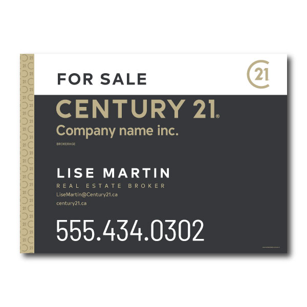 Pancarte officielle de Century 21. Imprimée sur un coroplast de haut grade 4MM. Pour poteaux, format 31.5 X 23.5 sans photo.