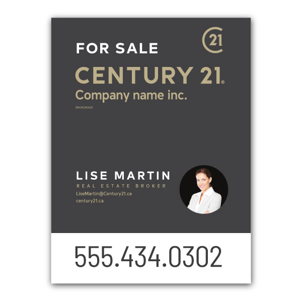Pancarte officielle de Century 21. Imprimée sur un coroplast de haut grade 4MM. Pour poteaux, format 23.5 X 31.5 avec la photo du courtier.