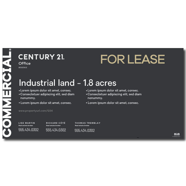 Pancarte commerciale officielle de Century 21. Imprimée sur un coroplast de haut grade 6MM. format 95.5 X 47.5 sans photo.