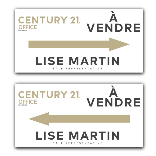 Directionnelle officielle de Century 21. Imprimée sur un coroplast de haut grade 4MM. Pour poteaux, format 23.5 X 11.5 sans photo.