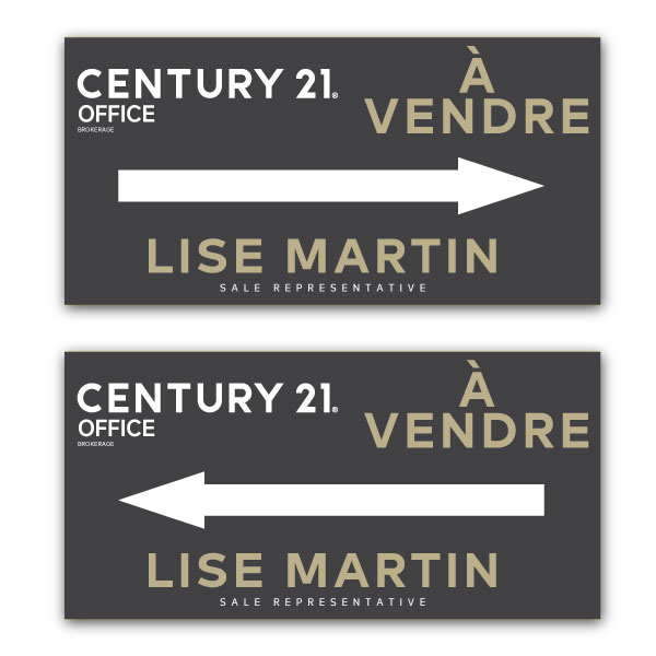 Directionnelle officielle de Century 21. Imprimée sur un coroplast de haut grade 4MM. Pour poteaux, format 23.5 X 11.5 sans photo.