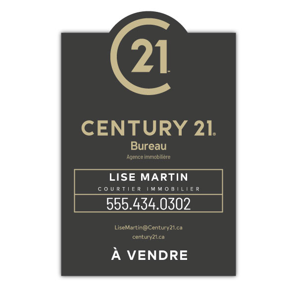 Pancarte officielle de Century 21. Imprimée sur un coroplast de haut grade 4MM. Pour poteaux, format 23.5 X 35.5 sans photo.