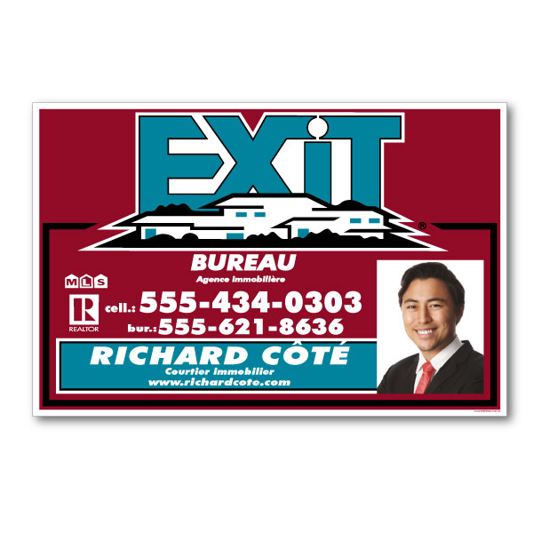 Pancarte officielle de Exit. Imprimée sur un coroplast de haut grade 4MM. Pour poteaux, format 35.5 X 23.5 avec la photo du courtier.