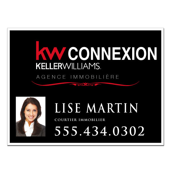 Pancarte officielle de Keller Wiliams. Imprimée sur un coroplast de haut grade 4MM. Pour poteaux, format 31.5 X 23.5 avec la photo du courtier.