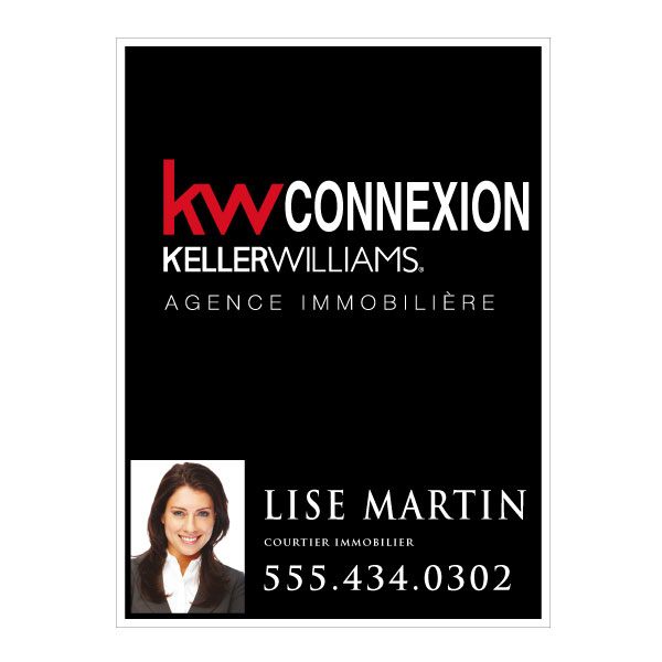 Pancarte officielle de Keller Wiliams. Imprimée sur un coroplast de haut grade 4MM. Pour poteaux, format 31.5 X 23.5 avec la photo du courtier.
