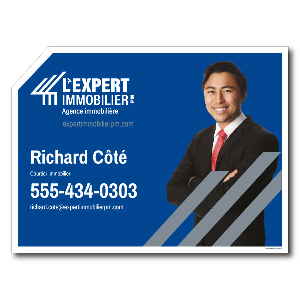 Pancarte officielle de L'expert Immobilier. Imprimée sur un coroplast de haut grade 4MM. Pour poteaux, format 31.5 X 23.5 avec la photo du courtier.