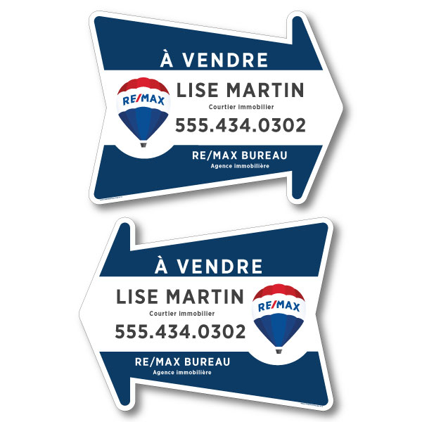 Directionnelle officielle de RE/MAX. Imprimée sur un coroplast de haut grade 4MM. Pour poteaux, format 23.5 X 17.5 sans photo.