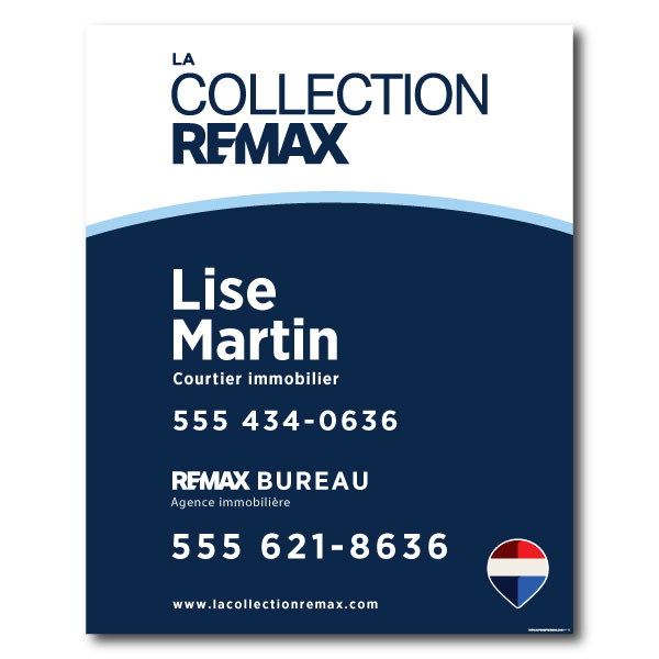 Pancarte officielle de RE/MAX. Imprimée sur un coroplast de haut grade 4MM. Pour poteaux potence, format 23.5 X 29.5 sans photo.