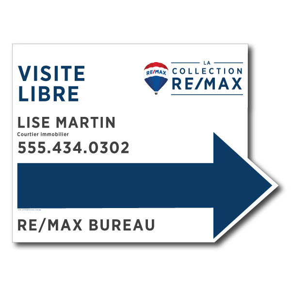 Directionnelle officielle de RE/MAX. Imprimée sur un coroplast de haut grade 4MM. Pour poteaux, format 23.5 X 17.5 sans photo.