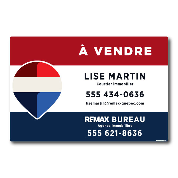 Pancarte officielle de RE/MAX. Imprimée sur un coroplast de haut grade 4MM. Pour poteaux, format 35.5 X 23.5 sans photo.