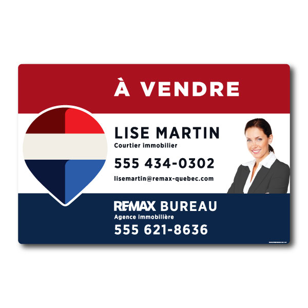Pancarte officielle de RE/MAX. Imprimée sur un coroplast de haut grade 4MM. Pour poteaux, format 35.5 X 23.5 avec la photo du courtier.