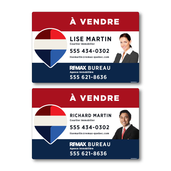 Pancarte officielle de RE/MAX. Imprimée sur un coroplast de haut grade 4MM. Pour poteaux, format 35.5 X 23.5 avec la photo des courtiers.