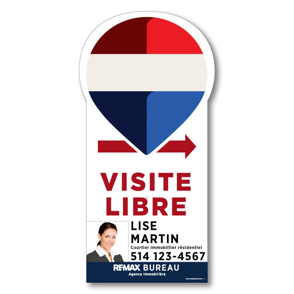 Pancarte officielle de RE/MAX. Imprimée sur un coroplast de haut grade 4MM. Pour poteaux, format 23 X 46 avec la photo du courtier.