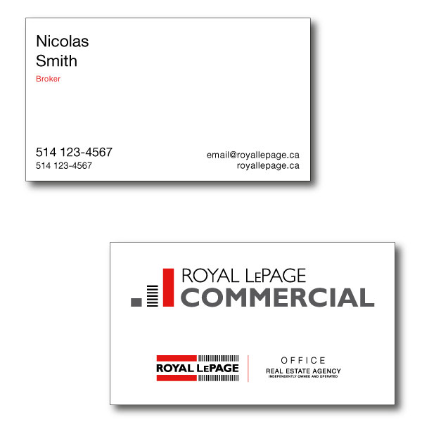 Cartes d'affaires de Royal Lepage. Imprimées sur un carton 16pts laminé mat deux cotés. format 3.5 X 2 Choix du type de lamination en option.