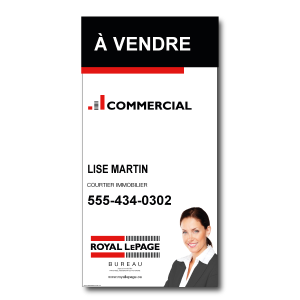 Pancarte commerciale officielle de Royal Lepage. Imprimée sur un coroplast de haut grade 6MM. format 47.5 X 95.5 avec la photo du courtier.