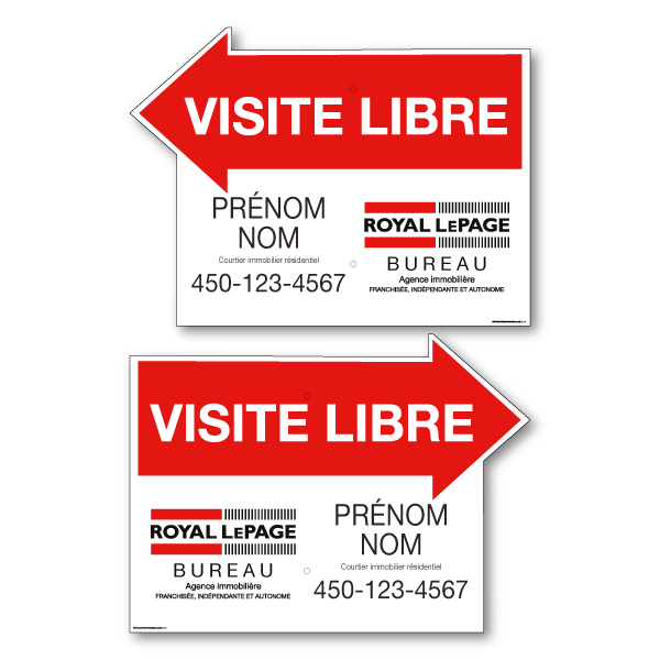 Directionnelle officielle de Royal Lepage. Imprimée sur un coroplast de haut grade 4MM. Pour poteaux, format 23.5 X 17.5 sans photo.