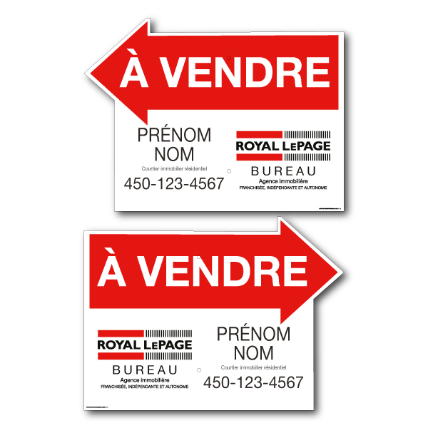 Directionnelle officielle de Royal Lepage. Imprimée sur un coroplast de haut grade 4MM. Pour poteaux, format 23.5 X 17.5 sans photo.