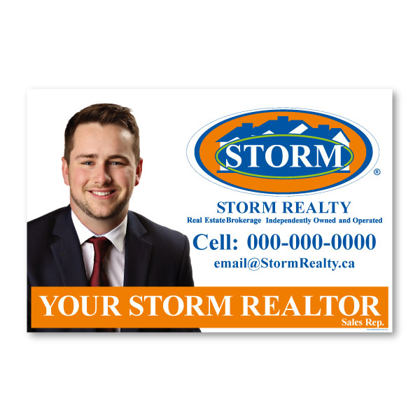 Pancarte officielle de Storm Realty. Imprimée sur un coroplast de haut grade 4MM. Pour poteaux, format 35.5 X 23.5 avec la photo du courtier.