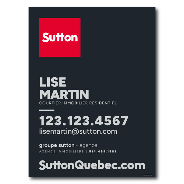 Pancarte officielle de Sutton. Imprimée sur un coroplast de haut grade 4MM. Pour poteaux, format 23.5 X 31.5 sans photo. Enseigne complète reflective.