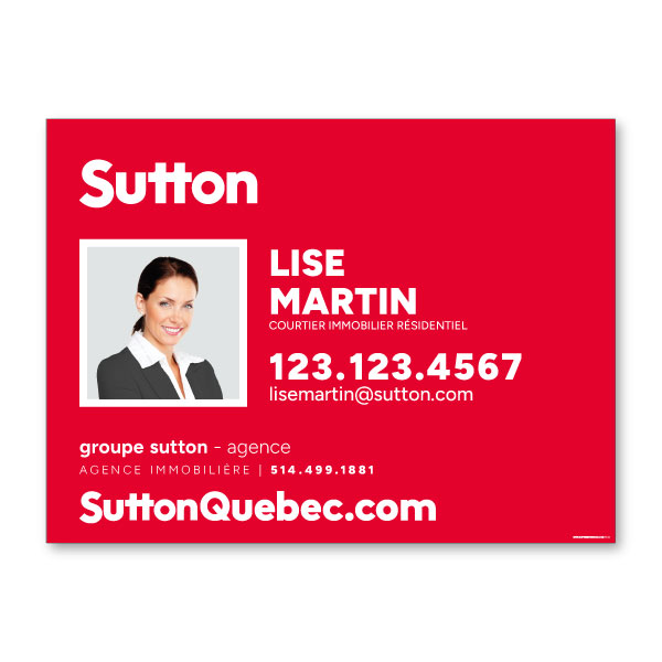 Pancarte officielle de Sutton. Imprimée sur un coroplast de haut grade 4MM. Pour poteaux, format 31.5 X 23.5 avec la photo du courtier.