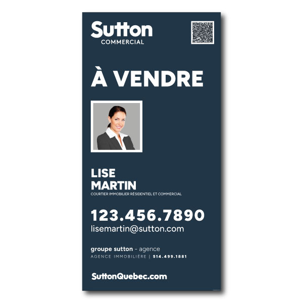 Pancarte commerciale officielle de Sutton. Imprimée sur un coroplast de haut grade 6MM. format 47.5 X 95.5 avec la photo du courtier.