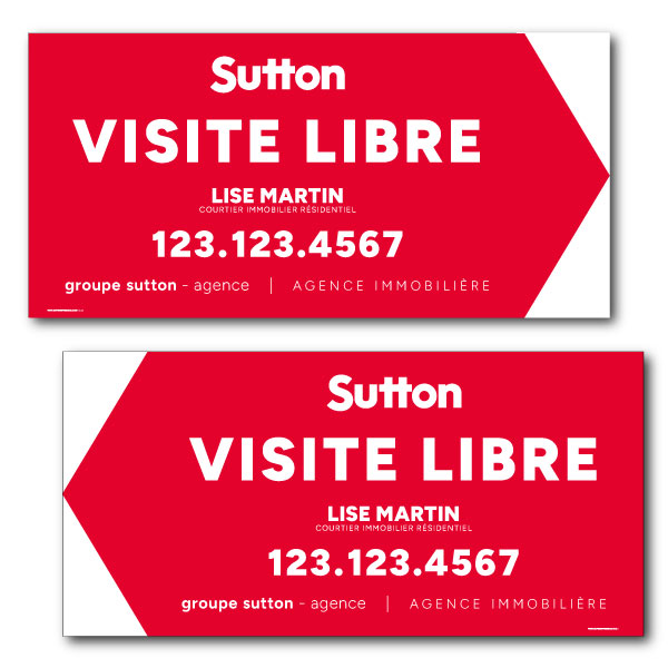 Directionnelle officielle de Sutton. Imprimée sur un coroplast de haut grade 4MM. Pour poteaux, format 23.5 X 11.5 sans photo.