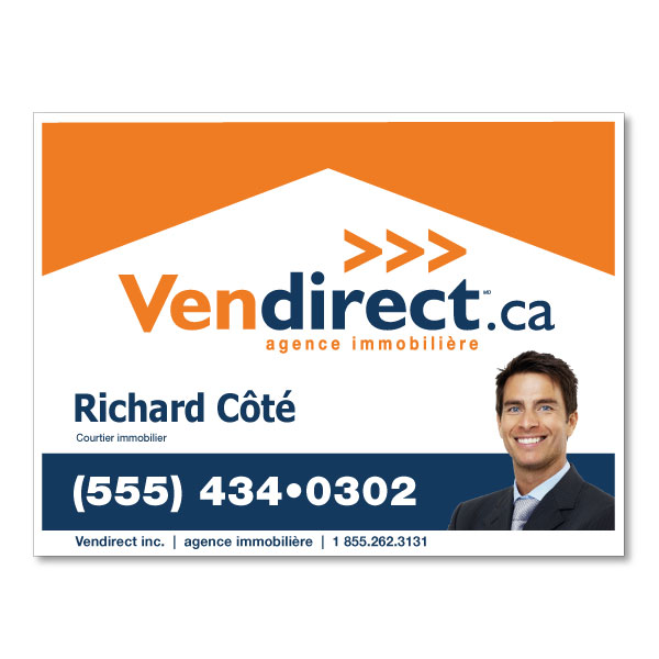 Pancarte officielle de Vendirect. Imprimée sur un coroplast de haut grade 4MM. Pour poteaux, format 31.5 X 23.5 avec la photo du courtier.