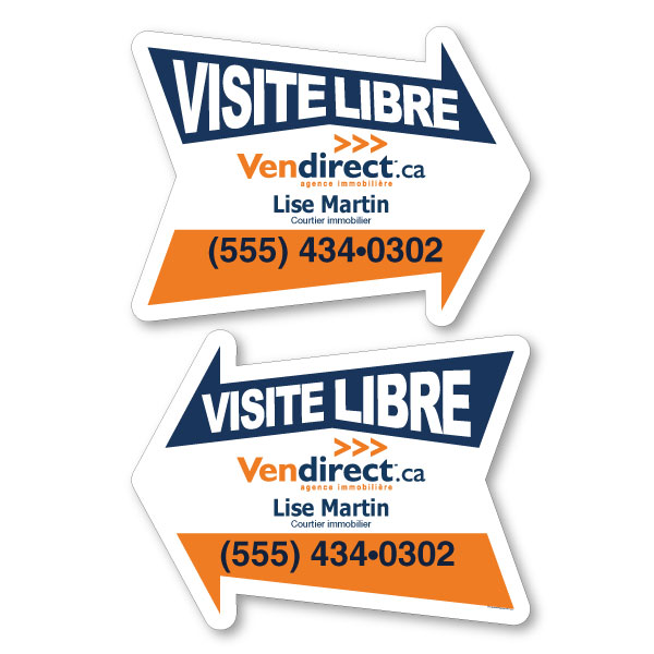 Directionnelle officielle de Vendirect. Imprimée sur un coroplast de haut grade 4MM. Pour poteaux, format 23.5 X 17.5 sans photo.