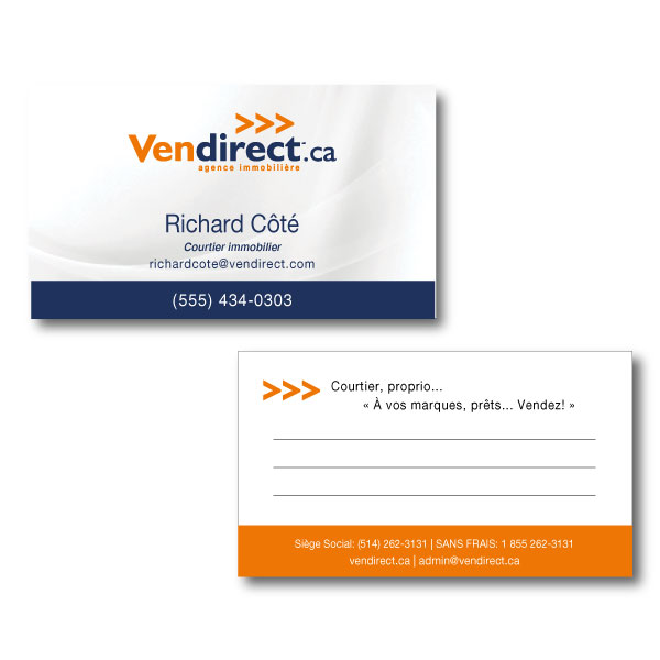 Cartes d'affaires de Vendirect. Imprimées sur un carton 16pts laminé mat deux cotés. format 3.5 X 2