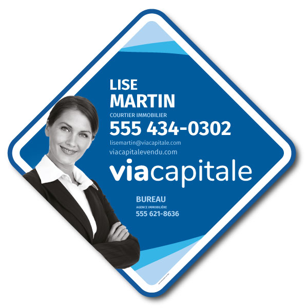 Pancarte officielle de Via Capitale. Imprimée sur un coroplast de haut grade 4MM. Pour poteaux, format 31.5 X 31.5 avec la photo du courtier.